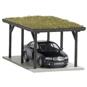 Bausatz für einen modernen Carport mit Flachdach. Mit farbig gebeizten Echtholzteilen und Begrünungsmaterial für das Dach. Mit Mittelklasse-Automodell. Das Fahrzeug kann von der Abbildung abweichen. Größe: ca. 40 x 70 mm, 32 mm hoch.